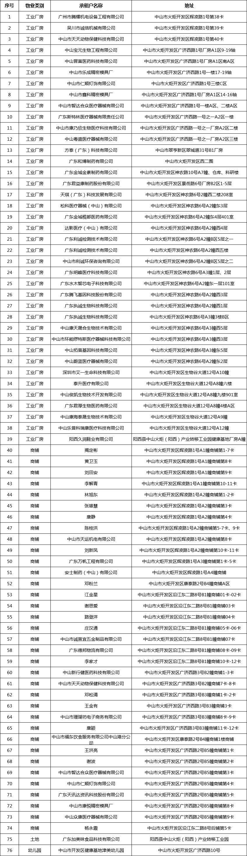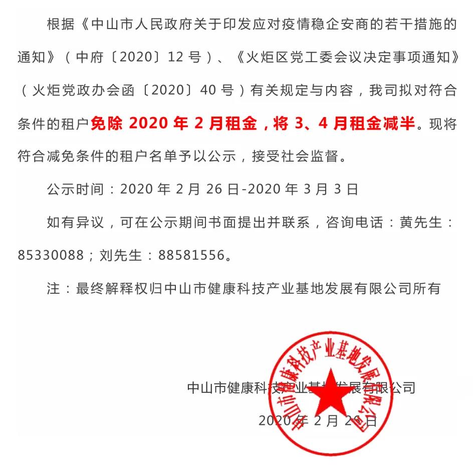 中山市健康科技產(chǎn)業(yè)基地發(fā)展有限公司關(guān)于經(jīng)營(yíng)性物業(yè)、土地租金減免名單的公示