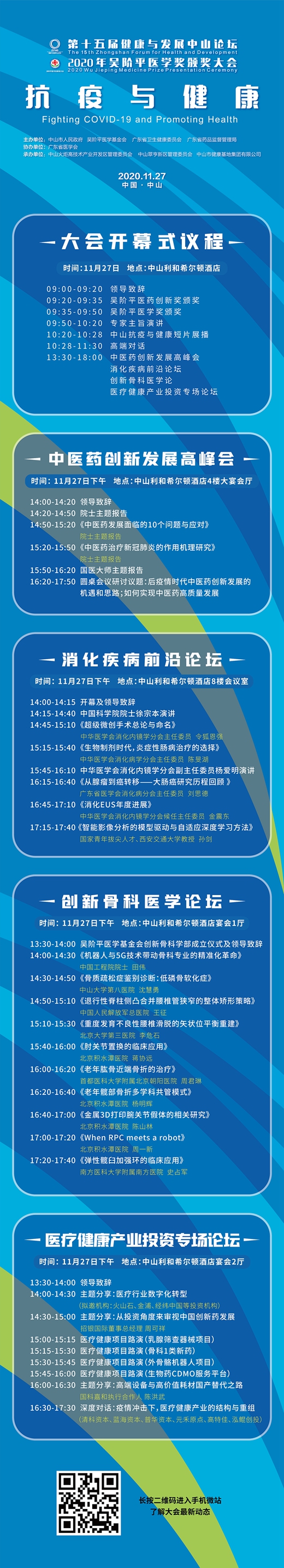 11月27日,第十五屆健康與發(fā)展中山論壇、2020年吳階平醫(yī)學(xué)獎(jiǎng)?lì)C獎(jiǎng)大會(huì)將在中山市隆重召開。