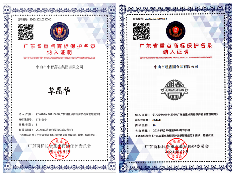 近日,廣東商標協(xié)會公布了廣東省重點商標保護名錄,健康基地集團園區(qū)企業(yè)中山市中智藥業(yè)集團有限公司的“草晶華”商標、中山咀香園食品有限公司的“咀香園”商標脫穎而出,被納入保護名錄。