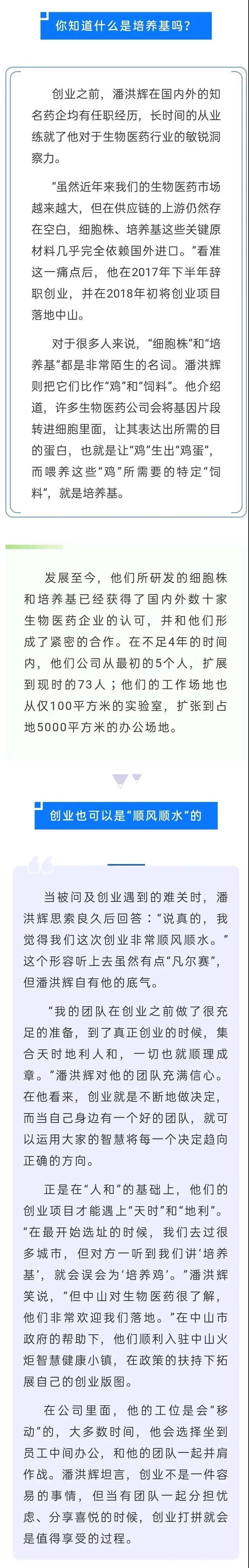隨著粵港澳大灣區(qū)融合發(fā)展深入,越來(lái)越多港澳青年選擇來(lái)到內(nèi)地創(chuàng)業(yè)追夢(mèng)。中央廣播電視總臺(tái)粵港澳大灣區(qū)之聲推出9集專題微紀(jì)錄片《創(chuàng)業(yè)在灣區(qū)》,分享在灣區(qū)九市創(chuàng)業(yè)的港澳青年的故事。在本集中,來(lái)自健康基地集團(tuán)園區(qū)企業(yè)——中山康天晟合生物技術(shù)有限公司(以下簡(jiǎn)稱“康晟生物”)董事長(zhǎng)潘洪輝,作為中山港澳青年創(chuàng)業(yè)代表,講述了他如何將微小的細(xì)胞“培養(yǎng)”成一番事業(yè)的創(chuàng)業(yè)故事。