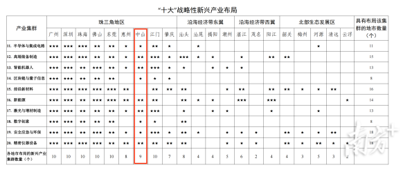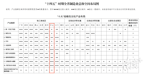 在“十大”戰(zhàn)略性支柱產業(yè)布局上,中山被列入全部產業(yè)布局范圍,是全省6個全部被列入的城市之一(分別為廣州、深圳、佛山、惠州、中山、江門)。其中,現代輕工紡織、生物醫(yī)藥與健康、現代農業(yè)與食品3個產業(yè)將中山作為核心布局城市,智能家電、軟件與信息服務、超高清視頻顯示3個產業(yè)將中山作為重點布局城市。
