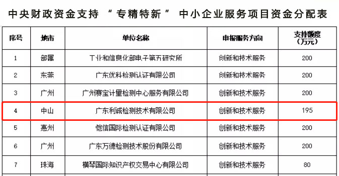 中山唯一!利誠檢測名列2021年中央財(cái)政資金支持“專精特新”中小企業(yè)服務(wù)項(xiàng)目名單