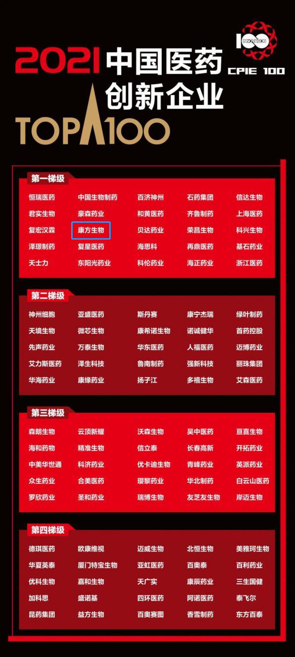 康方生物入選“中國醫(yī)藥創(chuàng)新企業(yè)100強”第一階梯