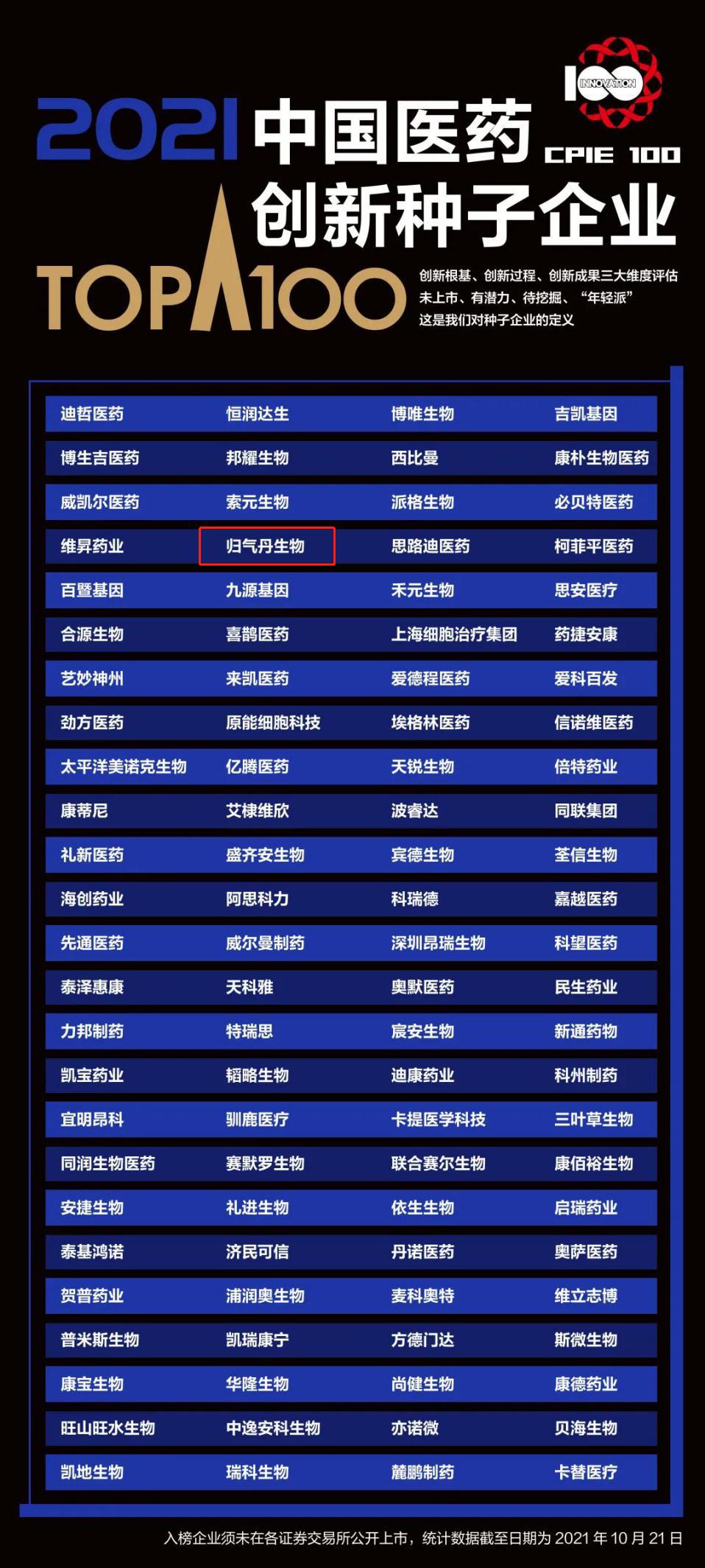 歸氣丹生物入選“2021中國醫(yī)藥創(chuàng)新種子企業(yè)100強”