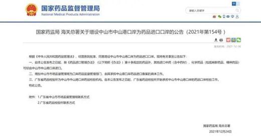 12月30日,國家藥監(jiān)局、海關(guān)總署發(fā)布公告,經(jīng)國務(wù)院批準(zhǔn),同意增設(shè)中山市中山港口岸為藥品進(jìn)口口岸,廣東省藥品檢驗(yàn)所作為中山港口岸藥品檢驗(yàn)機(jī)構(gòu),市市場監(jiān)督管理局作為口岸藥品監(jiān)督管理部門。