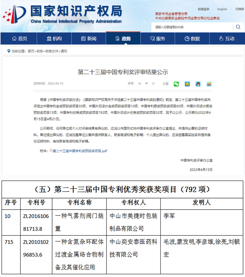 近日,中國專利獎評審辦公室完成第二十三屆中國專利獎公示,健康基地園區(qū)3家企業(yè)項目上榜,其中中山奕安泰醫(yī)藥科技有限公司(以下簡稱“奕安泰”)和中山市美捷時包裝制品有限公司(以下簡稱“美捷時”)等公司榮獲中國專利優(yōu)秀獎。
