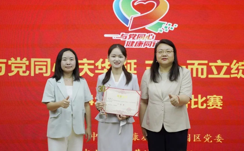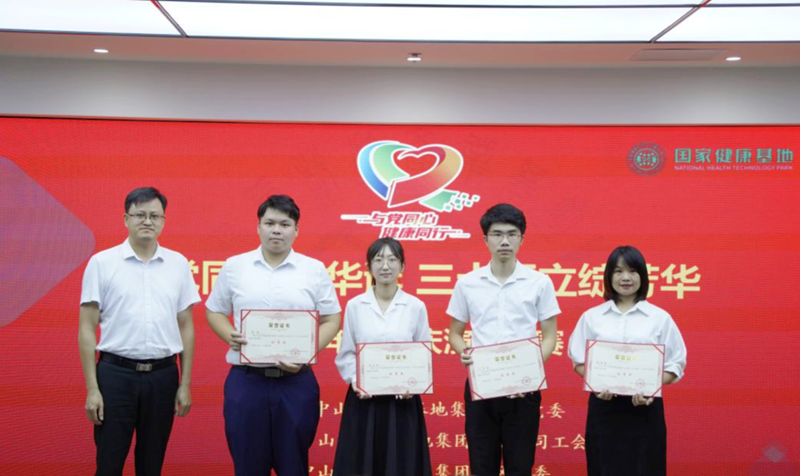 中山港街道團(tuán)工委書(shū)記高穎與健康基地集團(tuán)園區(qū)黨委書(shū)記、總經(jīng)理萬(wàn)鶴群為一等獎(jiǎng)獲得者胡雅文(行政部)頒獎(jiǎng)