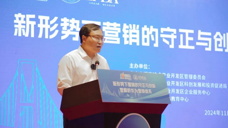 中山火炬開發(fā)區(qū)黨工委委員、管委會(huì)副主任肖宜東致辭,他指出本次活動(dòng)旨在共同探討營銷領(lǐng)域的最新創(chuàng)新理念、技術(shù)趨勢(shì)、成功案例和政策資訊,進(jìn)一步促進(jìn)政產(chǎn)學(xué)研合作,優(yōu)化營商環(huán)境,并推動(dòng)區(qū)域創(chuàng)新與企業(yè)高質(zhì)量發(fā)展。他表示,在全球化和數(shù)字化浪潮下,企業(yè)要在競(jìng)爭(zhēng)中立于不敗之地,就必須把企業(yè)的發(fā)展融入到國家發(fā)展大局中,不斷探索適應(yīng)市場(chǎng)變化的營銷策略。希望大家能從本次活動(dòng)中汲取智慧和靈感,結(jié)合各自企業(yè)的實(shí)際,探索適合企業(yè)發(fā)展的營銷創(chuàng)新之路。