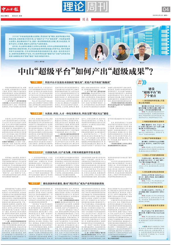 近年來,中山建有長春理工大學中山研究院、中科中山藥物創(chuàng)新研究院、中國檢科院大灣區(qū)研究院、中山先進低溫技術(shù)研究院等重大科研平臺,同時與港深科研平臺加速對接。今年全市將加快市級實驗體系打造,建設(shè)一批共性中試平臺,加快科技成果轉(zhuǎn)化產(chǎn)業(yè)化。中山如何用好這些“超級平臺”力促產(chǎn)業(yè)科技互促雙強?本期理論周刊“圓桌”邀請了相關(guān)專家進行研討。