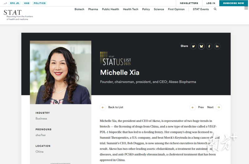 近日,國際著名生物醫(yī)藥行業(yè)媒體STAT發(fā)布了全球生命科學(xué)領(lǐng)域《The 2025 STATUS List》(2025年領(lǐng)軍人物榜單)。該榜單從全球醫(yī)療政策、生物技術(shù)、衛(wèi)生技術(shù)、醫(yī)學(xué)和衛(wèi)生保健等領(lǐng)域,遴選了對塑造健康與生命科學(xué)未來全球最具有影響力的50位領(lǐng)軍人物。健康基地園區(qū)企業(yè)康方生物創(chuàng)始人、董事長、總裁兼首席執(zhí)行官夏瑜入選,成為唯一獲此殊榮的亞洲企業(yè)CEO。