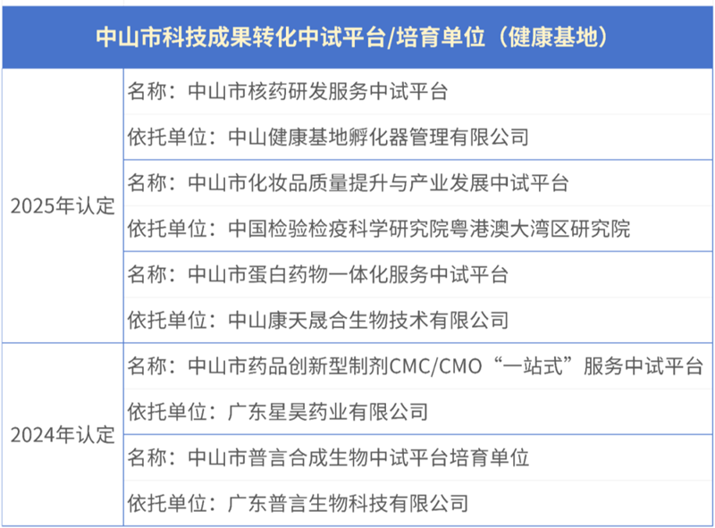 中山市科技局在會(huì)上發(fā)布了2025年中山市科技成果轉(zhuǎn)化中試平臺(tái)及培育單位認(rèn)定名單,梁子財(cái)為10家中試平臺(tái)及培育單位進(jìn)行了現(xiàn)場(chǎng)授牌。至此全市共有12家市級(jí)科技成果轉(zhuǎn)化中試平臺(tái)、4家培育單位,健康基地分別占4家和1家。