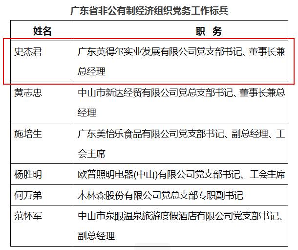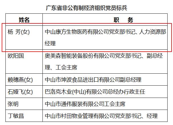 6月27日,廣東省非公有制經(jīng)濟組織黨建工作座談會在廣州召開,總結(jié)全省非公經(jīng)濟組織黨建工作,選樹一批先進單位和個人。其中,中山市共有6個非公企業(yè)黨組織獲獎,12名先進個人獲獎。在這其中,健康基地園區(qū)企業(yè)康方生物醫(yī)藥有限公司黨支部書記楊芳和廣東英得爾實業(yè)發(fā)展有限公司黨支部書記、董事長兼總經(jīng)理史杰君分別獲得“廣東省非公有制經(jīng)濟組織黨員標(biāo)兵”和“廣東省非公有制經(jīng)濟組織先進黨組織”。