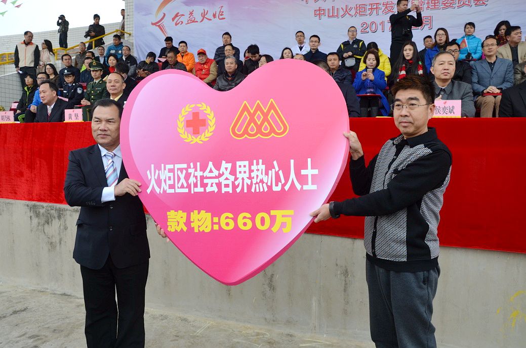 咀香園健康食品(中山)有限公司首席技術(shù)官?gòu)堁咏艽砘鹁鎱^(qū)社會(huì)各界熱心人士向火炬區(qū)紅十字會(huì)捐贈(zèng)款物660萬(wàn)元