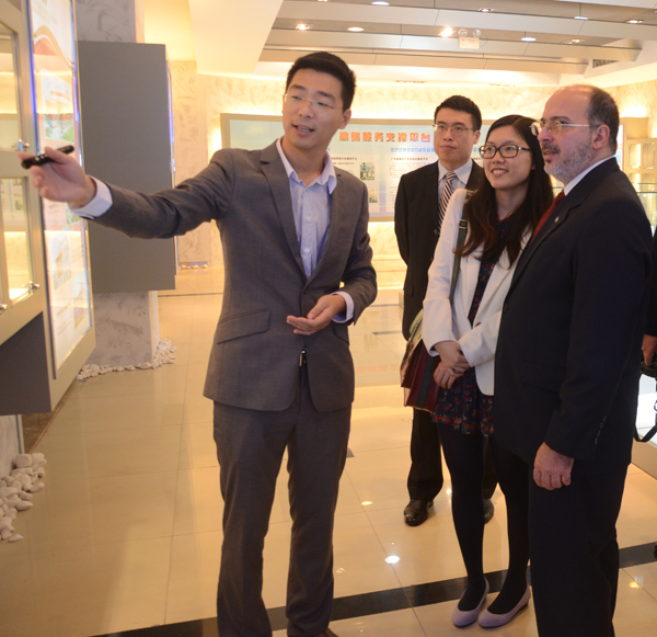 當(dāng)日上午,古巴駐華大使白詩德一行首先參觀了健康基地生物谷展廳,健康基地工作人員為其介紹了園區(qū)概況、地理優(yōu)勢、下屬企業(yè)、優(yōu)惠政策等。座談中,白詩德詳細(xì)了解了火炬開發(fā)區(qū)的發(fā)展歷史、健康產(chǎn)業(yè)園區(qū)的創(chuàng)辦初衷,以及中山市、開發(fā)區(qū)和健康基地對落戶企業(yè)提供的相關(guān)扶持政策、稅收優(yōu)惠,園區(qū)管理模式和服務(wù)經(jīng)驗等。