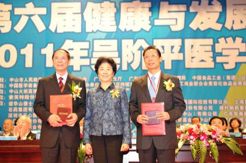 【大公報訊】中新社中山19日消息:中國醫(yī)學(xué)界最高規(guī)格的個人獎項──吳階平醫(yī)學(xué)獎今天在廣東中山市舉行頒獎大會,鍾南山院士、韓濟(jì)生院士獲得2011年吳階平醫(yī)學(xué)獎。全國政協(xié)副主席、中科院院士、吳階平醫(yī)學(xué)獎評委王志珍向兩位獲獎?wù)哳C發(fā)了獲獎證書和獎?wù)隆?